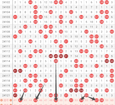 第三:50-60这个小区间需要重点关注会出现多个号码,防范等间距遗漏的号码,关注冷号会开出,重点关注区间联动号码。