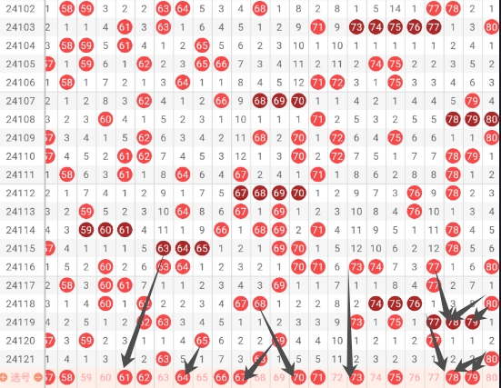 第一:根据整体走势来看本期第4区间热度应该会有所上升,可以把重点放在70-80这个小区间进行选号需要重点关注61 62 66 67 70 71 73 75 78 79这些号码。